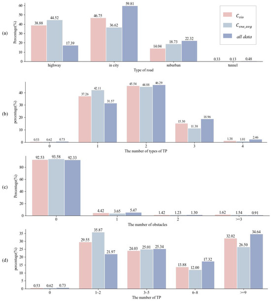 Comparison of scene elements in the top 20% of scenario complexity for and : (a) percentage of different road types, (b) percentage of number of traffic participant types, (c) percentage of obstacle quantities, and (d) percentage of traffic participant quantities.