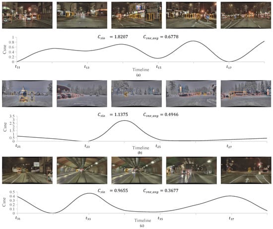 In the first scenario (Figure 6a), = 0.6778 and = 1.8207. Despite the complexity of each scene in this scenario not being particularly high, its location within a bustling district amplifies uncertainty. The lighting conditions, number of obstacles, and vehicle speeds undergo frequent fluctuations; particularly notable are the significant variations in pedestrian volume. These factors collectively elevate the scenario’s complexity.