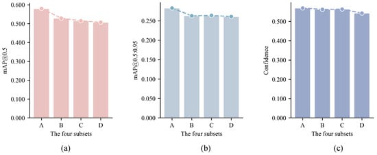 Performance comparison of object detection in different subsets: (a) comparison of mAP@0.5, (b) comparison of mAP@0.5:0.95, and (c) comparison of average confidence.