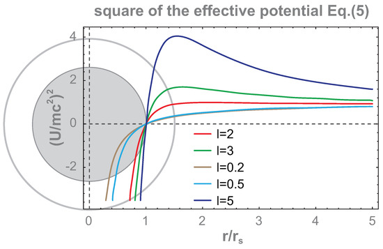The square of this potential is plotted in Figure 1, illustrating the main features of the black hole singularity neighborhood. From this figure, we note that the squared potential is steeper at the greater the angular momentum (this property of the folded spacetime near a black hole is often interpreted such that close to the event horizon, the centrifugal force additionally attracts a particle, quite oppositely to the classical Newton gravitation center).