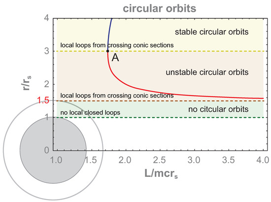 where the sign + in the second equation corresponds to stable orbits (at the minimum of ) and the sign − to unstable ones (at the maximum of ). Particular stable and unstable circular orbits depend on the angular momentum and on the energy of a particle. In Figure 2, the radii of stable and unstable circular orbits of the particle in the vicinity of the event horizon are shown as functions of the angular momentum , which are determined by the solution of the second equation in the pair (6)—for sign +, the upper branch (the blue line in the figure) gives the radii of stable circular orbits. This branch terminates in the point A at —i.e., the innermost stable circular orbit exists at for and (the energy is determined by the first equation of the pair (6)). The innermost unstable circular orbit (in the solution of the second equation of (6) with the sign −) occurs at for . The branch for unstable circular orbits (marked by red line in the figure) begins at point A and terminates asymptotically in infinity at the radius . Below this radius, no circular orbit exists. Though Equation (6) is written for a particle with mass m, the above derivation can be repeated for zero rest mass particles (like photons). The innermost unstable circular orbits occurs at for all particles regardless of their mass (also for photons with zero rest mass). This universal limiting orbit is frequently called the photon sphere rim (the photon sphere extends from the rim to the event horizon).