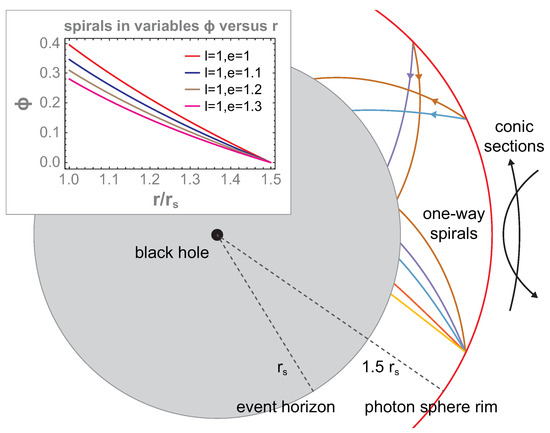 Trajectories of particles which have crossed the photon sphere rim inward, have the form of short spirals directed onto the event horizon—this follows from the solution of Equation (3) in the radius sector . In the figure, there are shown these spirals for several initial conditions and motion integrals and as specified in the Inset (in which spirals are shown in the coordinates—azimuthal angle versus radius). Though unidirectional spirals can mutually intersect (for opposite signs of angular momenta), it is impossible to close any loop built from their pieces. It means that particles in the photon sphere cannot mutually exchange positions if they belong to the multi-particle system which has passed the photon sphere rim inward. The timing of traversing these spirals is defined by Equation (2) written in the ordinary time of a remote observer. Changing to the proper time (or to any other curvilinear coordinates in different metrics) does not change the homotopy class of these spirals—local closed loops are not admissible beneath the photon sphere rim in contrary to the upper neighborhood, where arbitrary small local loops are possible due to the crossing of conic sections.