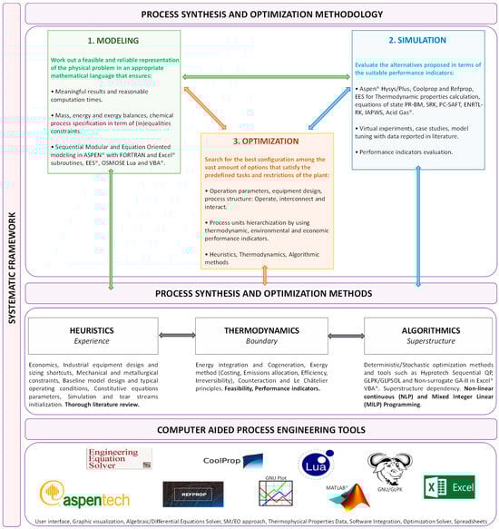 Thermodynamic optimization of industrial energy systems is crucial for finding solutions to reduce energy consumption and mitigate losses, leading to environmental and economic benefits. It involves applying thermodynamic principles to enhance the performance of the industrial, chemical and power generation systems, from individual components to entire plants. Among the widely used techniques, heat integration (i.e., the pinch method) and exergy analysis stand out for their ability to pinpoint sources of inefficiency []. However, those systems are part of a larger ecosystem, involving complex exchanges and interactions with other energy systems, and with the society and the environment. For this reason, process integration and thermodynamic optimization methods have been extended from a classical perspective of waste heat recovery to include a holistic design and optimization approach. In fact, a systemic dimension of process integration can cover aspects like (i) heat pumps and electrification; (ii) carbon capture, use, and sequestration; (iii) industrial symbiosis and circularity; (iv) urban energy systems’ integration; (v) waste management; (vi) power-to-x-to-power; (vii) seasonal energy storage, and (viii) integration to gas and electricity services.