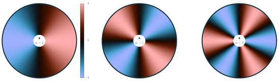 While we continue to postpone it, evaluation of the collision integrals is possible for a known . Still, Equation (14) remains an integro-differential equation that is difficult to handle. The strategy that we pursue here is to make use of a Fourier transform. As we are particularly interested in the emergence or relaxation of angular order and generally working in a parameter regime close to the free problem, we only perform this transform with respect to the angular degrees of freedom and assume spatial homogeneity of for the rest of this work. This is to keep the presentation concise, and taking the full spatial dependencies into account poses no fundamental problem [15,48,95]. The convention of Fourier transformation we use is that the mode of to the wavenumber m is given by
