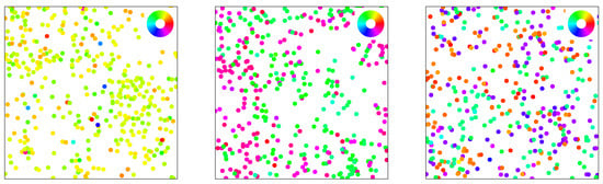 Finally, the kind of interaction between any pair of angles is crucially affected by the chelation number in the argument of the interaction kernel. This allows us to control the symmetry of the alignment interaction, cf. Figure 2, with corresponding to the case of polar interactions and to nematic interactions. Also shown is the case of triatic interactions for as a representative for higher n-atic interaction (as observed, for example, in dihedral liquid crystals [80]) types with n-fold symmetry. A suitable order parameter is given by the bond order parameter [81]. Generally, there are n stable and n unstable equilibria. While we are focused on and the case of has been treated [46,70] in the literature, we provide a general treatment for the sake of self-containedness. The symmetry of the interaction kernel directly affects the positional statistics observed in agent-based simulations (to be introduced in Section 4), see Figure 3.