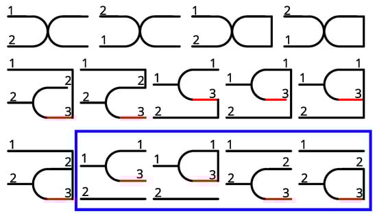 We follow the diagrammatic approach of Balescu [69] to reduce the resulting equations for to terms that actually contribute, utilizing a kinetic equivalent of the linked cluster theorem. We represent reduced one-particle distribution functions by unconnected horizontal lines that are tagged by their respective particle index; a k-tuple of horizontal lines connected by a vertical line represents a reduced k-particle correlation function. Each diagram contains one vertex that corresponds to the interaction kernel, (with a convention that the derivative is to be taken with respect to the (upper, where ambiguous) incoming line) and, finally, the lines corresponding to the given degrees of freedom start on the left and all other degrees of freedom (red lines in the figure) are to be integrated over. The important part to understand is that only fully connected (in the sense that every point on any line can be reached on lines from any other point) diagrams can contribute to the correlation function. In Figure 4, we show all the diagrams corresponding to the result of naively inserting Equation (6) into Equation (5b). The diagrams contained within the blue box are not fully connected and, therefore, do not contribute to . Unaffected by these considerations is the free () part of the time evolution. Reconstituting these considerations into equations, we find that
