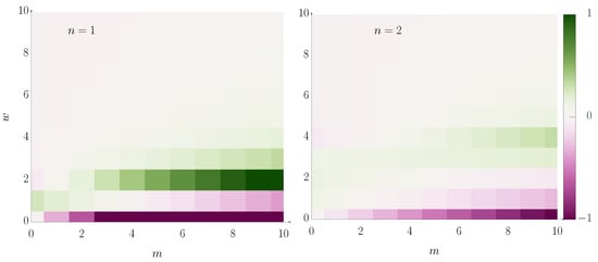Graphical representation of the Landau contributions, , to the collisional mode coupling matrix. We omit constant pre-factors and some values are outside the value range depicted here to increase clarity. We find that these second-order corrections display a clear self-mixing ( is negative).
