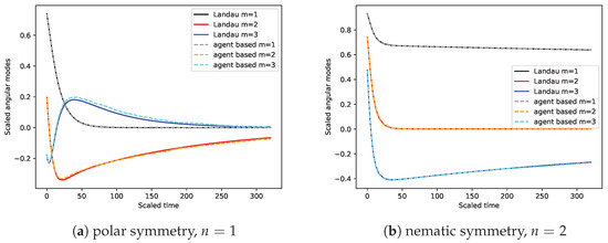 Fourier modes for systems at with and for . The modes extracted from the agent-based simulation (dashed lines, averaged over realizations) are compared to the theoretically predicted modes (labeled Landau, solid lines) derived by the Landau equation kinetic theory approach. The scaled time is . It is qualitatively intuitive that lower values of the coupling constant are necessary to see similarly small deviations in the case as in the case, because linearization of the interaction kernel, cp. Equation (1), around equilibria yields a response to a deviation . The parameters used include the following: , , , , and (a) , , , (b) , , .