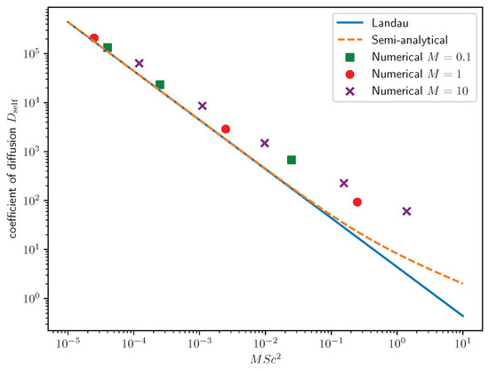 By means of a Green–Kubo relation, this is directly linked to the velocity correlation time , which determines the decay of the velocity autocorrelation function as . As has been pointed out before in ref. [15], this quantity does not exist in mean-field calculations. The calculation via a Boltzmann–Lorentz-type theory is easily adapted, and we do not reproduce it in full here, but a rough argument would be as follows: if we label a very small fraction as tracer particles with modes , then their interaction partners will essentially always be with regular particles whose modes we denote by . Going through the derivation of Equation (17), it is apparent that the analogue for modes of the tracer particles, which explicitly takes into account spatial derivatives as is necessary for diffusive phenomena, would be