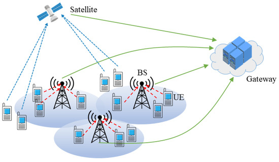 Although terrestrial cellular networks undergo several generations of evolution, half of the world still faces the challenges of achieving ubiquitous access, primarily due to the economic costs associated with base station (BS) deployment [1,2]. To address this challenge, the third-generation partnership project (3GPP) promotes a promising architecture, referred to as integrated satellite–terrestrial networks (ISTNs) [3,4], which integrate satellite communication and terrestrial networks and can provide wide-area coverage, universal multiaccess, and ubiquitous connectivity. ISTNs have a wide range of applications, such as personal mobile communication, transportation, aviation and navigation, Power Internet of Things (PIoT), emergency disaster relief, and so on.