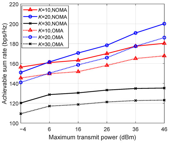 Figure 3 presents the achievable sum rate versus the maximum transmit power. The total number of UEs is set to , , . The number of receive antennas is set to . It is seen that the achievable sum rate increases with the maximum transmit power. The NOMA scheme is obviously better than the OMA scheme, which indicates the benefits of adopting NOMA in uplink ISTNs. The performance degrades when the number of UEs is set to 30. This is because, when the number of receive antennas exceeds the number of UEs, the system has a sufficient degree of freedom to distinguish signals from different UEs and minimize interference among them. However, once the number of UEs exceeds the number of antennas, the system lacks the necessary degree of freedom for leveraging multiuser diversity, resulting in the degradation of system performance.
