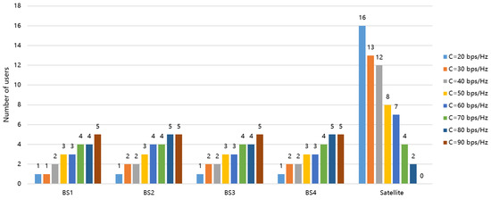 In Figure 5, the user association results are presented for various sets of backhaul link rate C. The maximum transmit power is set as 26 dBm. It is seen that the distribution of the number of UEs accessing different terrestrial BSs is relatively even. As the backhaul link capacity increases, fewer UEs will access the satellite. This is because UEs will prioritize accessing terrestrial BSs with better channel conditions. However, in situations where the capacity of terrestrial BSs is constrained, UEs will turn to accessing the satellite in order to guarantee the fulfillment of their QoS requirements.