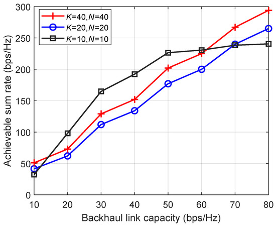 Figure 6 presents the achievable sum rate versus the backhaul link capacity. The total number of UEs K and receive antennas N are set as follows: , , , , and , . The maximum transmit power is set as 26 dBm. It is seen that the performance increases with the increase in backhaul link capacity. When the backhaul link capacity is relatively low, the sum rate for 10 UEs is higher than the sum rates for 20 UEs and 40 UEs. This is because when the backhaul link capacity is small, the number of UEs that terrestrial BSs can accommodate is relatively limited, and excess UEs will access the satellite. This results in severe interference among the UE signals received by the satellite, thereby impairing the overall performance. When the number of UEs is relatively low, terrestrial BSs are sufficient to provide service to all UEs even with limited backhaul link capacity. As the backhaul link capacity of these BSs continues to rise, the achievable sum rate approaches saturation, leading to a flattened trend in the sum rate for 10 UEs thereafter.