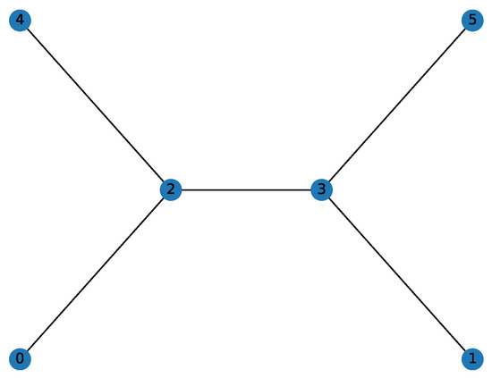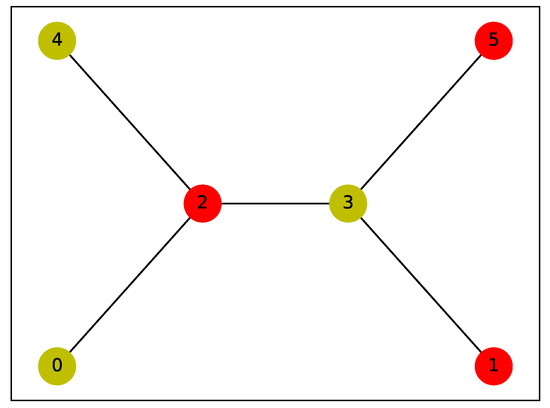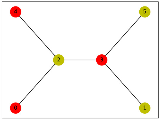 The parameters were set to , , and , where P is 0.75 times the number of nodes in the selected graph, with a maximum of 10,000 iterations. Under these conditions, we employed the QAOA to solve the IDP for the 6-node graph shown in Figure 2. Figure 3 presents the probability distribution of the final sampling results, where the bit strings and have probabilities of 0.0797 and 0.0793, respectively, significantly higher than those of other configurations. Visualizing these results on the graph, we observe that the outcome is a consequence of the inherent symmetry of the graph (as shown in Figure 4 and Figure 5), demonstrating the effectiveness of the QAOA in solving the IDP. Although the sampling probabilities of the two optimal bit strings are higher than those of other configurations, both remain on the order of . Given reasonable choices for the penalty coefficients, this may be due to two potential causes. First, a low number of layers might have been used, as suggested by Farhi et al. [17]. Second, the classical optimizer may have become trapped in a local minimum. Since COBYLA is a gradient-free optimization method, it may have disadvantages in escaping local minima compared to gradient-based algorithms like BFGS. Developing a suitable gradient and integrating gradient-based methods, such as BFGS, with the QAOA represents a promising direction for future research.
