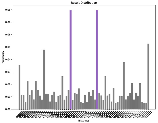 The probability distribution of the bit strings when , , , and maximum iterations = 10,000. The sampling probabilities for the two most probable bit strings are highlighted in purple.