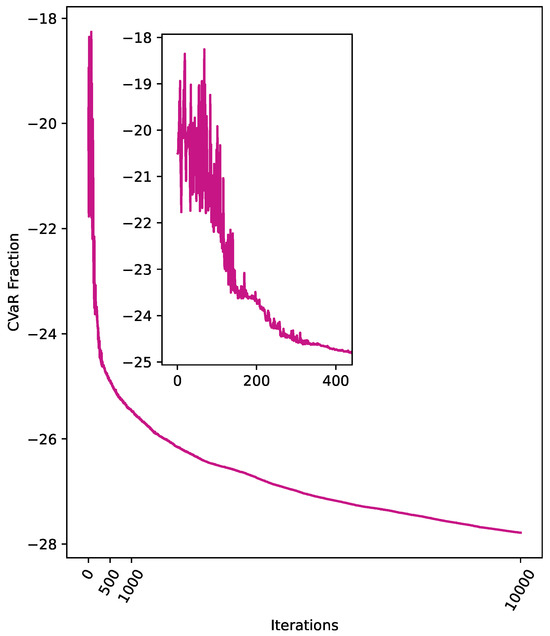 In this experiment, we used IBM’s qasm_simulator as the backend, with QAOAAnsatz serving as the quantum circuit generator and BaseSamplerV1 as the sampler. The optimization method employed was COBYLA, with a default function tolerance of . The cost function used for optimization was the Conditional Value-at-Risk (CVaR), which has been widely adopted in various studies to improve both the convergence probability and speed when applied to QAOA [33,34]. As described by Kolotouros and Wallden [33], a variant of CVaR called ascending-CVaR is defined in Equation (17). Here, K represents the total number of samples, and the energy values obtained from the K measurements are sorted in ascending order. denotes the energy value of the i-th measurement. The cost function is then calculated as the average of the first energy values. This approach prioritizes lower-energy regions, which are more closely related to the optimal solution, rather than considering the entire energy distribution, as in Equation (15), thereby accelerating the convergence process.