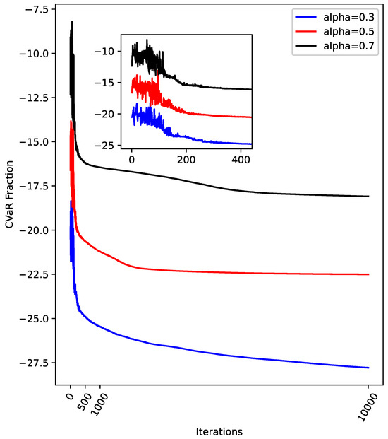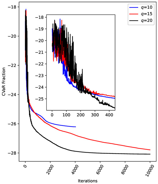 In Figure 7, we set , , and a maximum of 10,000 iterations and compare the changes in cost for , , and . As observed in Figure 6, the cost decreases sharply within the first iterations for all values of . Beyond this range, the reduction in cost becomes more gradual. Overall, the cost reduction trend is consistent across the different values of . The data in Figure 7 indicate that the QAOA achieves good convergence when solving the IDP, regardless of the setting. In Figure 8, we compare the cost convergence for , with , , and a maximum of 10,000 iterations. It is evident that when , the cost converges before reaching the maximum number of iterations, meeting the function tolerance. For and , while the cost quickly levels off for , the cost for continues to decrease significantly, even at 10,000 iterations. This suggests that, had the maximum number of iterations been further increased, the cost for would likely continue to decrease. From the perspective of the QAOA, as the number of layers increases, tends to approach the optimal objective function value [17]. However, for COBYLA, a larger number of layers may negatively affect convergence speed and increase the likelihood of getting trapped in a local minimum. Referring to Figure 8, while the cost converges the fastest when , the CVaR value at convergence is the largest, likely due to the limitation imposed by the smaller number of layers. For , despite having the smallest CVaR value within the set range of maximum iterations, it is possible that the optimization prematurely converges to a local minimum. Therefore, when applying the QAOA to solve the IDP, careful consideration must be given to the choice of the number of layers. A basic recommendation is that when fast convergence is prioritized, starting with a small-layer QAOA structure is advisable. However, when seeking higher-quality solutions, a slightly larger-layer QAOA structure is necessary. In the case of larger-layer QAOA structures, caution should be exercised regarding the potential for getting trapped in a local minimum.