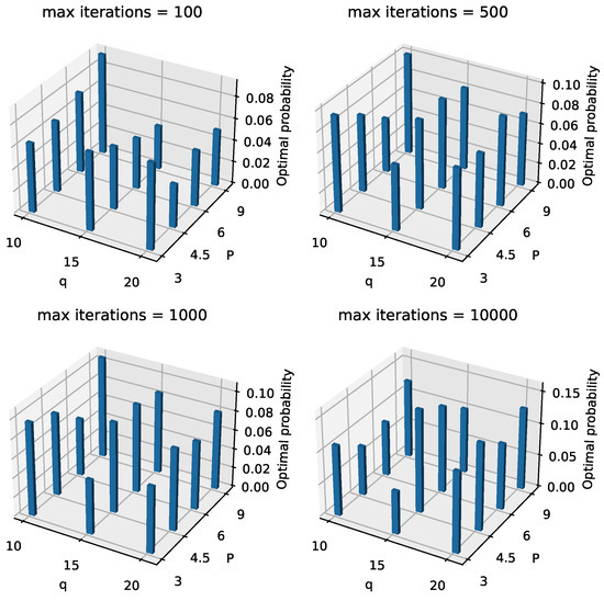 Landscape of optimal probabilities of different q, P, and maximum iterations when = 0.3.