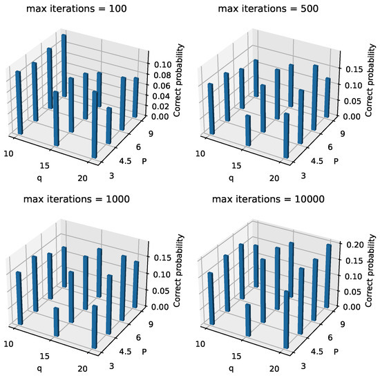 Next, in Figure 9 and Figure 10, we present the optimal and correct probabilities for different combinations of q, P, and maximum iterations, with . On a macro level, both the optimal and correct probabilities generally increase as the number of maximum iterations increases. When the maximum iteration number is set to 100, many parameter combinations result in low probabilities for both categories, but these probabilities improve significantly as the number of iterations increases. For instance, Table 3 shows how these probabilities change as the number of iterations increases, with , , and . This behavior aligns with our expectations. Additionally, based on observations from Figure 9 and Figure 10, we note that when the maximum iteration number is small, the small-layer QAOA structure outperforms the large-layer QAOA structure in terms of both types of probabilities. This finding contradicts the theoretical prediction that the expectation of should approach the optimal value as the number of layers increases. Upon further analysis, we hypothesize that this behavior arises because the larger-layer QAOA requires optimizing a greater number of angles compared to the smaller-layer QAOA, as the number of angles is twice the number of layers. For classical optimization algorithms, as the number of angles increases, if the number of iterations is insufficient, the classical optimizer becomes a bottleneck in the process. As the number of iterations increases, the large-layer QAOA structure gradually begins to outperform the small-layer structure in terms of both types of probabilities. Although the large-layer QAOA does not always outperform the small-layer structure for all parameter combinations (for example, in Figure 9, where , , and ), the robustness of the tests allows us to observe this trend in most other combinations. From the analysis of Figure 9 and Figure 10, we draw the following insights: when aiming to solve the problem with a smaller maximum number of iterations, a smaller-layer QAOA structure can be used. However, when seeking to maximize the probability of obtaining an IDS or optimal IDS, a larger-layer QAOA structure should be prioritized.