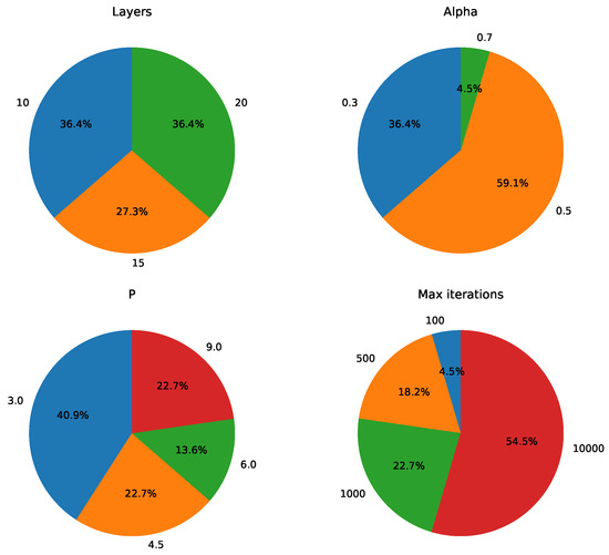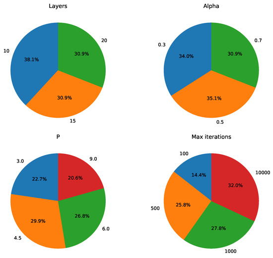 As part of the further analysis of the parameter dependency of the QAOA, we recorded the parameter distribution results for all experiments where corresponds to the optimal IDS or an IDS. Taking the number of layers q as an example, in the 144 experiments, was the IDS in 97 of them. Suppose that in these 97 experiments, the number of experiments with , , and is , , and , respectively. The corresponding ratios are , , and . Similarly, for , P, and maximum iterations, we compute the ratios in the same manner and present the results in pie charts. The statistical results for being the optimal IDS or an IDS are shown in Figure 11 and Figure 12.