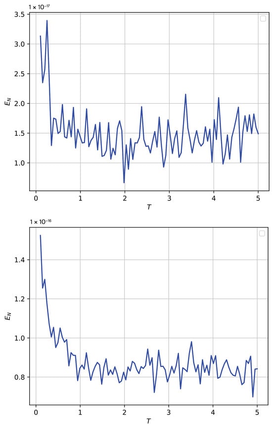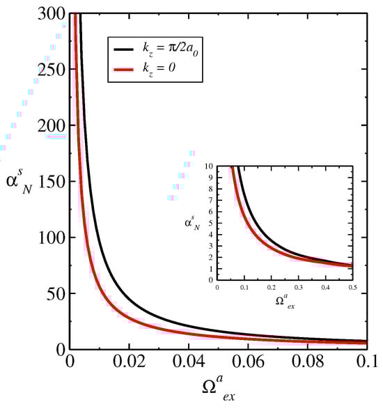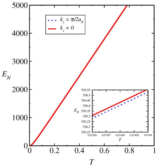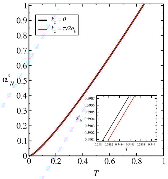 In Figure 3, we obtain as a function of T for and , which corresponds to the Brillouin zone edge in the z direction. We have . We obtain that the very small variation in the curves of the spin Nernst coefficient as a function of T for different values and displayed in Figure 3, in the gap closing loop and where the system suffers a topological phase transition, generates a similar influence on the behavior of the curves of entanglement negativity vs. T. In general, the spin Nernst effect introduces non-equilibrium spin dynamics in the system, affecting the quantum correlations between spins, where, depending on the strength of the spin–orbit coupling and the temperature gradient, the spin Nernst effect may influence the entanglement generation, propagation, or decay in the ferrimagnetic material. Thus, the interplay of spin Nernst effect, anisotropy, and quantum correlations may give rise to novel phenomena such as spin Hall effect described by the spin Nernst coefficient. The very small variation in the behavior of with is shown in the inset of Figure 3, indicating a small effect of the different magnon bands induced by on . In Figure 4, we obtain as a function of for , , , and . Since depends on and biquadratic term , , , we obtain a dependence of with and in the same way. We obtain a small variation in the curves for different , as shown in the inset of the figure. The small variation obtained in the negativity and spin Nernst coefficient is a consequence of the small variation in the spin wave spectra with different intensities of external field along the easy axis indicated by .