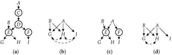 We now contrast functional projection and classical projection using the causal graph in Figure 3a, assuming that the observed variables are and the functional variables are . Applying classical projection to this causal graph yields the causal graph in Figure 3b. To apply functional projection, we first functionally eliminate C and D from Figure 3a, which yields Figure 3c; then, we project Figure 3c on variables (), which yields the causal graph in Figure 3d. So we now need to contrast Figure 3b (classical projection) with Figure 3d (functional projection). The latter is a strict subset of the former, as it is missing two bidirected edges. One implication of this is that variables G and I are not d-separated by A in Figure 3b because they are not d-separated in Figure 3a. However, they are D-separated in Figure 3a; hence, they are d-separated in Figure 3d. So functional projection yields a DAG that exhibits more independencies. Again, this is because G and I are D-separated by A in the original DAG, a fact that is not visible to the projection but is visible to (and exploitable by) the functional projection.