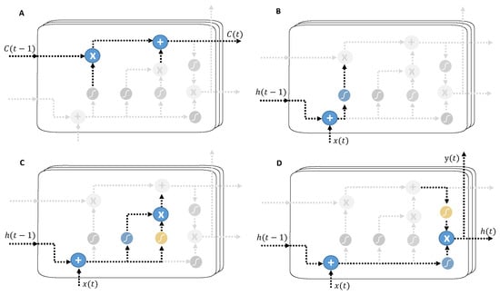 Network long short-term memory detailed. (A): cell state; (B): forget gate; (C): input gate; and (D): output gate.