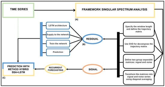 A time series in (A). It is executed according to the singular spectrum analysis mechanism (B). The residuals are captured and treated according to the characteristics of the long short-term memory network. Finally in (C), the prediction is made by adopting properties of both SSA and the LSTM.