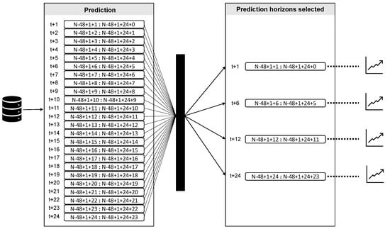 Figure 4. Prediction horizons. Data were normalized within the interval [0, 1]. Then, they were divided into two matrices: training and test. The models were trained with data and tested with the last 48 data. For the time series, 10 simulations were carried out with the adapted approach (singular spectrum analysis and long short-term memory), and the model with the best performance was selected. The results for all models correspond to the prediction of one, six, twelve, and twenty-four steps ahead of the test set. Likewise, Table 1 shows the three metrics that evaluated the performance of the adapted methodology.