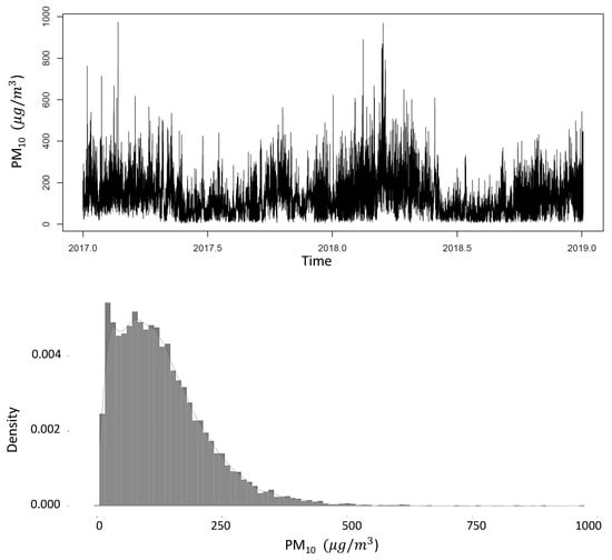 This section presents the statistical analysis on the original time series of PM10 concentration (see Figure 5). Likewise, the evaluation of the models is included. The dataset comprises two years (from 1 January 2017 to 31 December 2018) and includes PM10 (g/m3) concentrations for the year, month, day, and hour. These data were obtained from the Servicio Nacional de Meteorología e Hidrología website of Peru, which provides air quality data for the entire country.