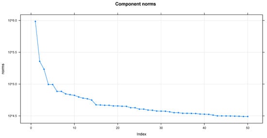Figure 6 presents the singular values or eigenvalues of the matrix X. The singular values were obtained through the singular value decomposition in step two of the decomposition stage, and their behaviors can be observed through the spectrum of the singular values of the trajectory matrix. One of the essential characteristics to observe is that the first singular value, the one with the highest absolute value, corresponds to the trend component of the series. Other helpful information is provided by checking for breaks in the singular value spectrum. In general terms, a purely residual noise series produces a slowly decreasing sequence of singular values. Since a slight and continuous decrease of the singular values is visualized, it can characterize the beginning of the noise of the time series. It is a way to validate the importance of each component. The main idea is to choose components that allow for better separability between signal and noise. In this case, we consider the first 14 components for the signal and the remainder for the noise.
