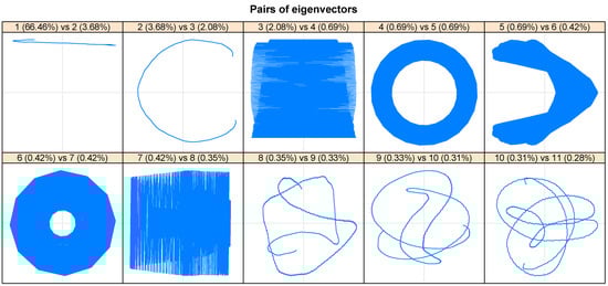 Pairs of eigenvectors—SSA. It is mainly observed that with the pair 6 (0.42%) vs. 7 (0.42%), the size of the seasonality is predicted since it can be differentiated that there is a seasonality of 12 by the number of sides reported by the figure. This is summarized here, in that the pairs 4 (0.69%) vs. 7 (0.69%) and 6 (0.42%) vs. 7 (0.42%) are components that are related to each other; that is, they are close to each other.