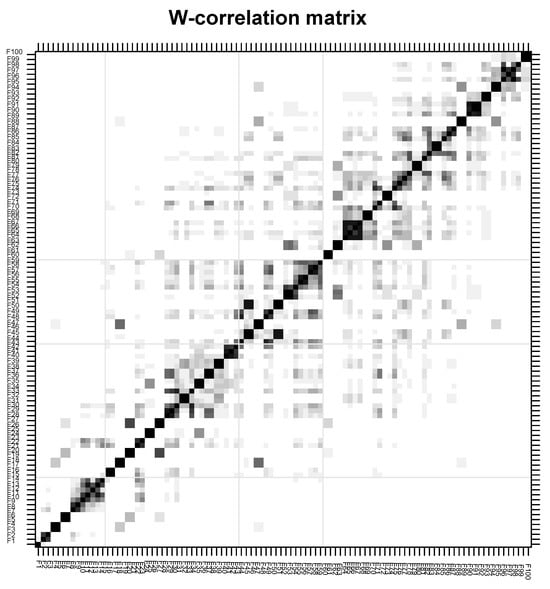 Correlation matrix—SSA. As observed, the diagonal indicates the autocorrelation of each component; in this case, there are 100 components. For example, the black squares represent a w-correlation of 1. Focusing on components 4, 5, 6, and 7, a high correlation is observed, the same as was observed in previous reports. They were similar in terms of magnitude and behavior. This similarity means that they can be grouped together. This report aims to maximize the correlations within the signal and within the noise, and minimize the correlations between the signal and the noise.