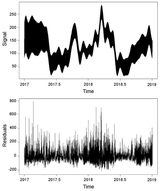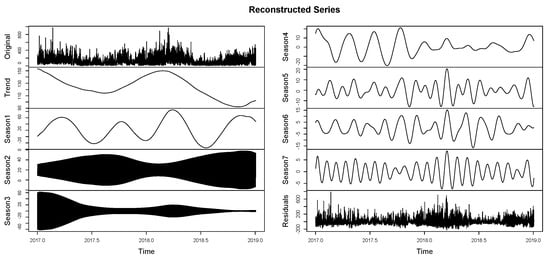 The components of the series can be differentiated as trend, seasonality, and residuals. This allows for evaluating the grouping of seasonalities (Figure 10) according to the previously reported components. On the other hand, in Figure 11, it is observed that this report clusters the different seasonalities seen in Figure 10. The same components of the time series are observed in a classified manner. This is because the seasonalities can be grouped by similarity, only defining the original series, the trend, seasonality, and residuals. Figure 12 shows the integration of the original time series and the two fundamental components of this process: signal and residuals. The signal will obviously be used within the recurrent forecasting, and the noise will enter the LSTM (both observed in Figure 13). In this context, it is emphasized that the reported noise is not white noise. It is a stochastic behavior not captured in the signal using singular spectrum analysis. The critical episodes in the time series become complex components for the SSA to capture.