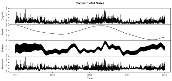 Reconstructed series—SSA. Extraction of information from the time series: trend, seasonality, and residuals.