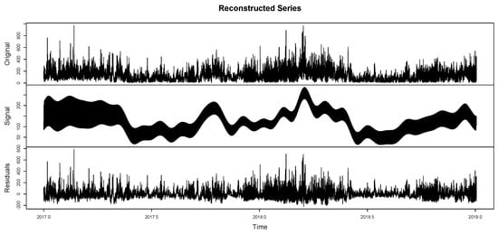 Reconstructed series III—SSA. Here, the original series, the signal, which describes its behavior based on the composition of both trend and seasonality, and finally, the noise (residuals), are integrated.