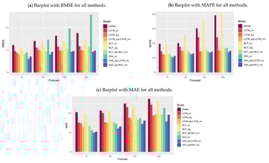 Accuracy measures (a) RMSE, (b) MAPE, and (c) MAE for all methods.