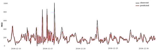 Behavior of the hybrid model between the observed PM10 values (represented by the black lines) and the predictions’ generated red lines).