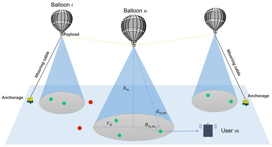 The 3D coordinates of the th balloon base station and the th user can be expressed, respectively, as and . Therefore, the distance between balloon n and user m is can be given by