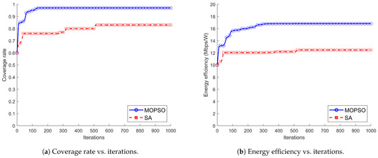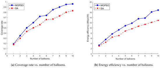 Figure 3 illustrates the coverage and energy efficiency versus iterations of MOPSO and SA with a fixed number of balloons of 10. The two algorithms are significantly different in terms of convergence speeds. MOPSO shows a stepwise increase, which means that it finds better solutions at each iteration step and gradually approaches the optimal solution set. After 130 and 300 iterations, the coverage and energy efficiency stabilized at 96% and 16.84 Mbps/W, respectively, which indicates that they found a deployment scheme that maximized the coverage and energy efficiency while satisfying the constraints. The coverage and energy efficiency of SA, although reaching higher values early at about 50 iterations, do not converge and continue to increase in the subsequent 300 and 500 iterations with a slightly upward trend and stabilize at 83% and 12.48 Mbps/W, respectively, after 500 iterations. Because SA generates a new solution randomly at each iteration and cannot use the previous information to guide the search direction, the convergence speed is very slow. There is a large gap between its overall performance and that of MOPSO, which shows a faster convergence speed due to its ability to use inter-particle collaboration and information sharing to search the solution space.