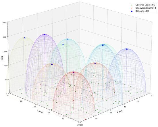 Figure 4 depicts the final positions of ten balloons deployed and their coverage under MOPSO calculation after 1000 iterations. It can be seen that the target coverage rate at this point is 96%, which matches the data at the end of MOPSO curves in Figure 2a and Figure 3a. The high-altitude tethered balloon communication system involves several interacting objectives such as energy efficiency and coverage, and MOPSO can effectively balance these objectives to find a more optimal deployment plan. This result is of great significance for the deployment of practical systems, implying that higher system performance can be achieved with MOPSO under the same resource input.