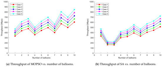 It can be observed from Figure 5a–Figure 7a that MOPSO can effectively optimize balloon locations and power allocation to increase the network capacity while keeping the latency and packet loss rate low. This is achieved through optimal spatial diversity exploitation and the efficient management of the radio frequency spectrum. MOPSO tries to find a better combination of locations in each iteration to maximize the coverage and the signal quality and thus improve throughput. However, when the numbers of balloons are 4, 7, and 9, there is a significant drop in throughput. That is attributed to the fact that it may fall into a local optimal solution, resulting in little difference in the location optimization effect for the increased numbers of balloons. From an electromagnetic wave propagation perspective, as the number of balloons increases, the interference in the network increases accordingly, which partially cancels out the performance improvement brought by MOPSO, resulting in a fluctuating increase in throughput. This phenomenon can be explained by the increased probability of co-channel interference and multipath fading effects in denser networks. The adaptive power control mechanism plays a moderating role in this process by dynamically adjusting the transmit power in an attempt to find a balance between coverage and interference control. This power adaptation directly affects the received signal strength and interference levels at user terminals, creating a complex electromagnetic environment that requires careful management. Network performance fluctuations can be regarded as a dynamic outcome reached by these multi-party games. In contrast, as shown in Figure 5b–Figure 7b, the overall performance of SA is not as good as that of MOPSO, which is mainly due to the lack of reasonable planning of balloon locations, resulting in overlapping coverage and causing signal interference and resource wastage. This leads to destructive interference patterns and increased inter-cell interference, degrading the physical layer performance. As the number of balloons increases, this overlap and interference problem becomes more serious, which in turn leads to poor overall network performance.