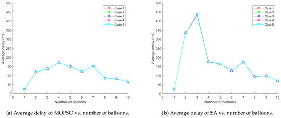 Figure 5, Figure 6 and Figure 7 demonstrate the relationship between total throughput, average delay, packet loss rate, and number of balloons when the communication system adopts MOPSO and SA, respectively, under five distribution scenarios for users. The experimental results show that MOPSO achieves a 37.09% improvement in total throughput, a 34.86% decrease in average delay, and a 13.69% reduction in packet loss rate compared to SA. From a physical point of view, these improvements can be attributed to better deployment locations causing better SINR management and more efficient utilization of radio resources. MOPSO always outperforms SA, especially when the number of balloons is high. The performance advantage of MOPSO is mainly attributed to its ability to optimize the deployment locations of balloons. Through a more reasonable deployment scheme, MOPSO can effectively avoid the overlapping of balloon coverage and mutual interference, shorten the data transmission path, and assign users to base stations with higher signal strength through adaptive power control. This optimization directly impacts the physical layer performance by reducing path loss, reducing co-channel interference and improving channel conditions. In contrast, SA may lead to coverage overlap or ground nodes connecting to distant base stations due to the randomness of balloon deployment locations, thus reducing the overall network performance.