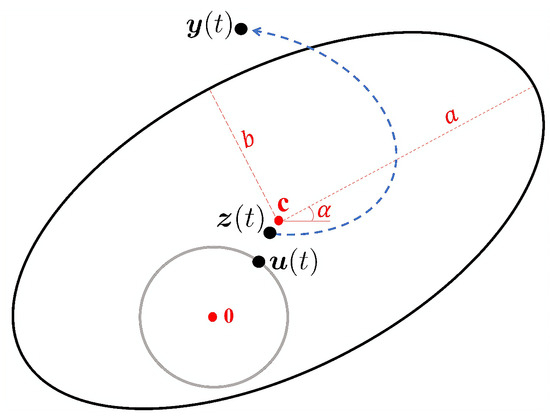 An ellipse in a plane can be uniquely described with five parameters: the semi-major axis a, the semi-minor axis b, the two-dimensional center position , and the incline angle . An ellipse can be transformed from a unit circle, as shown in Figure 1. We define a functional variable using a GP with mean . Here, is defined on the unit circle via a vMF distribution, and it is transformed using the following formulas: