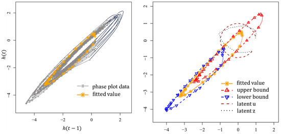 Visualization of the proposed model’s performance in fitting phase plot data. (Left panel) The curve fitted by the proposed model to the observed phase plot data. (Right panel) Fitted values with corresponding 95% confidence intervals (upper and lower bounds), along with the estimated latent variables z and u.