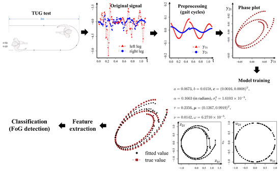 Detecting FoG presents challenges in gait analysis. FoG is characterized by a sudden and temporary inability to initiate or continue walking. Recent technological advancements, including wearable sensors and deep brain stimulation, offer avenues for managing and mitigating this complex symptom [82,83]. In a controlled laboratory setting, wearable devices were utilized to collect data regarding freezing gait from 15 patients diagnosed with Parkinson’s disease during the timed up-and-go (TUG) test [84]. The TUG test entails patients walking in a straight line from a starting position, turning around, and returning to the starting point. In this study, patients with fewer than three freezing cycles were filtered, resulting in a final sample of 8 patients. An overview of our analytical procedure for FoG detection is presented in Figure 5.