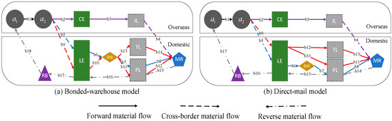 It is important to note that, for PM chains , , and , although the domestic CBEC platform operates a quantity of each period , links and only contain forward material flows , while link only contains the reverse material flow . Furthermore, under the NB scenario, the actual sales quantity of (denoted as ) is not equal to the operational quantity of at the bonded warehouse (denoted as ). Therefore, the material flow in links for PM chains , , and is , which is not equal to the quantity operated by the front-end node company for product . The material flow in links for PM chain can be obtained with the specific expressions detailed in Appendix B.