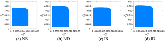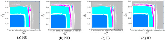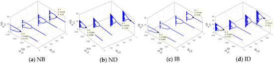 Three-dimensional bifurcation diagrams of the system with respect to and under the (a) NB, (b) ND, (c) IB, and (d) ID scenarios.