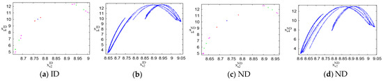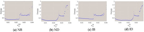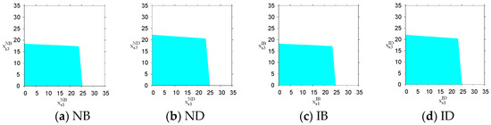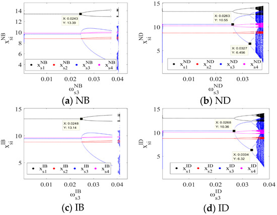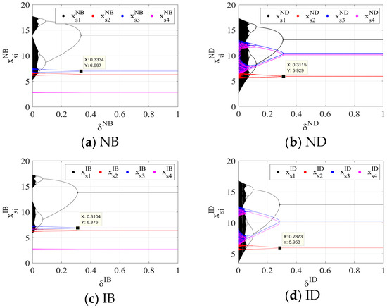 Bifurcation diagrams of the system after chaos control under the (a) NB, (b) ND, (c) IB, and (d) ID scenarios.