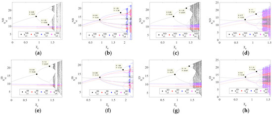 Bifurcation diagrams of the system with respect to under the (a) NB, (c) ND, (e) IB, and (g) ID scenarios. Bifurcation diagrams of the system with respect to under the (b) NB, (d) ND, (f) IB, and (h) ID scenarios.